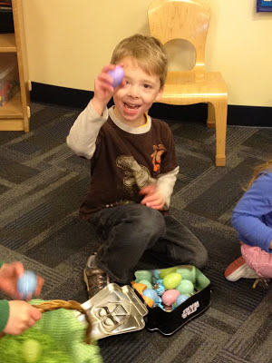 We had two changes to our "normal" Easter celebration this year, which both turned out to be super fun! Bebe and Papa spent the night on Saturday since Bebe's foot is still healing from her surgery, and it was very rainy and muddy outside, so the Easter bunny hid our eggs inside instead of outside. He got pretty creative - we have since discovered several randomly throughout the house! Tricky bunny.